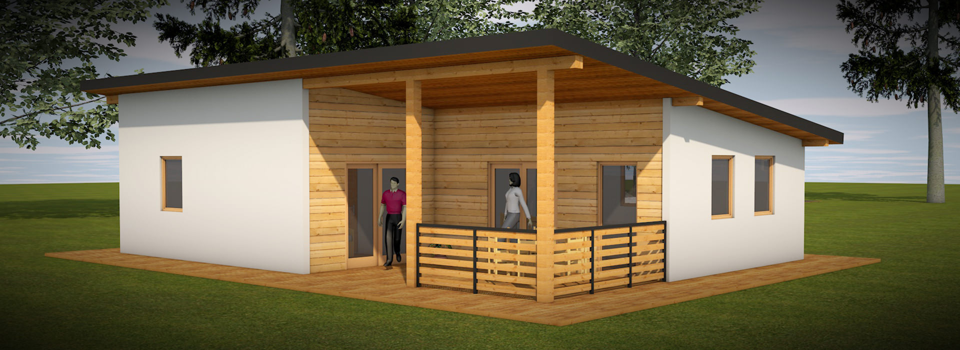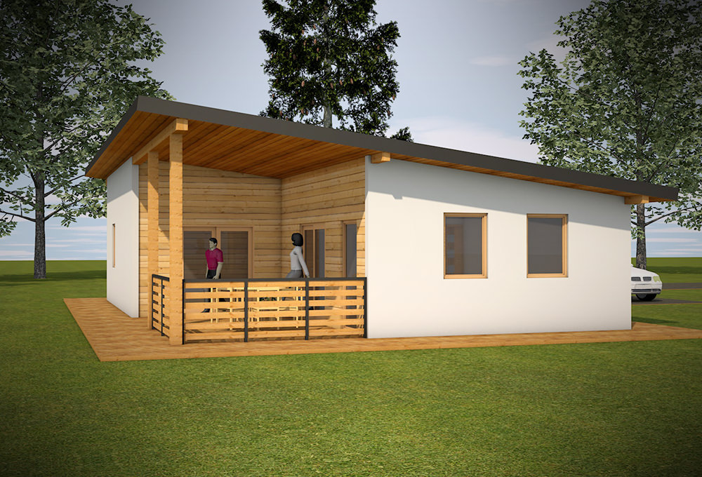 Zunanji izgled je klasičen s streho enokapnico, njena lesena obloga napušča pa daje hiši moderen pridih. Oblika hiše in velika pokrita terasa, do katere je vhod skozi dnevni prostor in spalnico, naredita hiši dodatno vrednost.
